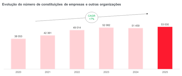 Portugal registou um novo máximo histórico na criação de empresas em 2025, com a constituição de 53 030 novas empresas, mais 3,1% (+1 571 constituições) do que em 2024, de acordo com o Barómetro da Informa D&B. Este registo surge depois de uma ligeira quebra no ano passado e retoma a tendência de crescimento que se verifica após a pandemia, durante o qual a criação de empresas aumentou, em média, cerca de 7% ao ano. ![]() Construção, Atividades imobiliárias, Agricultura e Tecnologias da informação e comunicação têm os maiores crescimentos Mais de metade dos setores registam crescimento na constituição de empresas. Serviços empresariais e Serviços gerais mantêm-se como os setores com maior número de novas empresas, mas o destaque vai para a Construção e as Atividades imobiliárias, com crescimentos expressivos de 15% e 20%, respetivamente. Embora com menor número de empresas, as Tecnologias da informação e comunicação e a Agricultura e outros recursos naturais têm também grandes crescimentos de 11% e 16%, respetivamente. ![]() Dentro dos diversos setores, destacam-se algumas atividades específicas com grandes crescimentos, como o alojamento de curta duração (+33%; +285 constituições), a programação informática (+28%; +294 constituições), a agricultura e pecuária (+21%; +273 constituições) e os serviços de apoio às empresas (+3,7%; +261 constituições). O setor dos Transportes teve a maior descida (-22%; -1 014 constituições), nomeadamente as ‘Atividades de serviços de transporte de passageiros, a pedido, em veículo com condutor’, cujas constituições de empresas desceram mais de dois dígitos pelo segundo ano consecutivo. A criação de empresas de Retalho sofreu também uma queda (-8,5%; -399 constituições). Apesar do aumento das constituições de retalho generalista (+46%; +318 constituições), as descidas no retalho alimentar (-44%; -479 constituições), automóvel (-8,6%; -128 constituições) e outros (-39%; -120 constituições), contribuíram de forma expressiva para a descida no setor. Os novos restaurantes e as atividades de saúde estão também entre as maiores descidas nas constituições de empresas em 2025. Crescimento transversal em quase todo o país O aumento das constituições de empresas em 2025 foi transversal a quase todo o país, mas concentrou-se sobretudo em distritos com maior densidade populacional e empresarial, como Leiria (+11%; +204 constituições), Braga (+6,7%; +247 constituições), Porto (+4,8%; + 418 constituições) e Lisboa (+2,1%; +338 constituições). Portalegre foi o distrito onde o número de constituições mais desceu (-12%; -52 constituições), sendo esta descida transversal à maioria dos setores de atividade. Encerramentos de empresas continuam em baixa Segundo os dados de 5 de janeiro de 2026 do Barómetro da Informa D&B, em 2025 encerraram 12 567 empresas em Portugal, um registo 18% abaixo do ano anterior, que se verificou em todos os setores de atividade. Devido ao desfasamento temporal entre a data efetiva de dissolução da empresa e a data da respetiva publicação, é expectável que o número final de encerramentos ocorridos no último trimestre de 2025 sofra um aumento considerável e sobretudo no mês de dezembro, o mês que tipicamente concentra o maior número de encerramentos. Como tal, espera-se que esta descida venha a ser menos acentuada. Insolvências descem 2% 2 037 empresas iniciaram um processo de insolvência em 2025, o que corresponde a uma descida de 2,2% (-45 insolvências) face ao ano anterior. Esta descida verifica-se após 2 anos de aumentos consecutivos deste indicador. O setor dos Transportes (+45%; +48 insolvências) registou o maior aumento de insolvências em 2025, um aumento que se verifica pelo 4º ano consecutivo neste setor. Apesar da descida, o setor das Indústrias é o que concentra o maior número de novas insolvências em 2025, seguida da Construção e Retalho. NOTAS Fonte de dados: publicações de atos societários efetuados no portal Citius do Ministério da Justiça até 05 de janeiro de 2026. SOBRE A INFORMA D&B |
